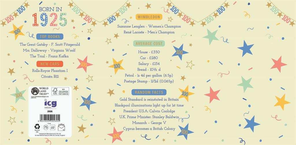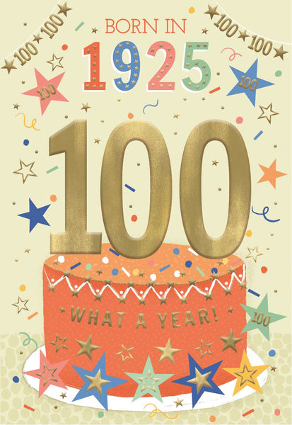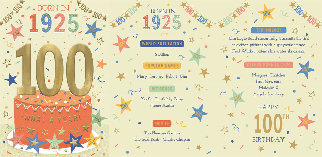 Send happy birthday wishes for their one hundredth birthday with this 100th birthday card. This 100th birthday card is the perfect way to celebrate their extra special centenary year and contains facts from the year the recipient was born including new technology of the year, popular names and popular songs and movies. Hot foil finish. Tri-fold card. This greeting card is printed on high quality board and is designed and printed in the UK