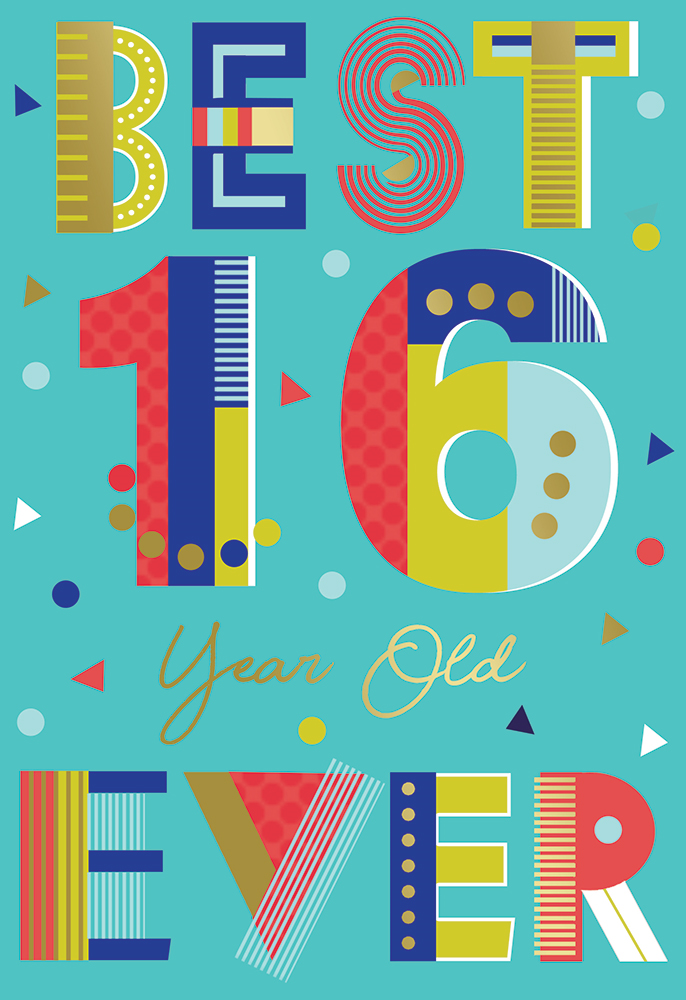 Celebrate their 16th birthday with this eye catching sixteenth birthday card. This greeting card boasts a vibrant and eye-catching modern design, complete with a shimmering gold foil finish and a full colour insert. Crafted in the UK, this card is guaranteed to add a splash of colour to their 16th birthday celebration.
