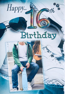 Let them know they are being thought about on their 16th birthday with this sixteenth birthday card. This 16th birthday card has a skateboarding themed photographic design. This 16th birthday card is printed on high quality board and is designed and printed in the UK.
