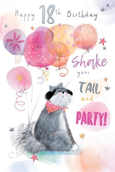 Celebrate their 18th birthday with this cute 18th birthday card. This 18th birthday card features a cute dog with pink balloons design with a hot foil finish with a full colour insert. This 18th birthday card is produced in the UK.