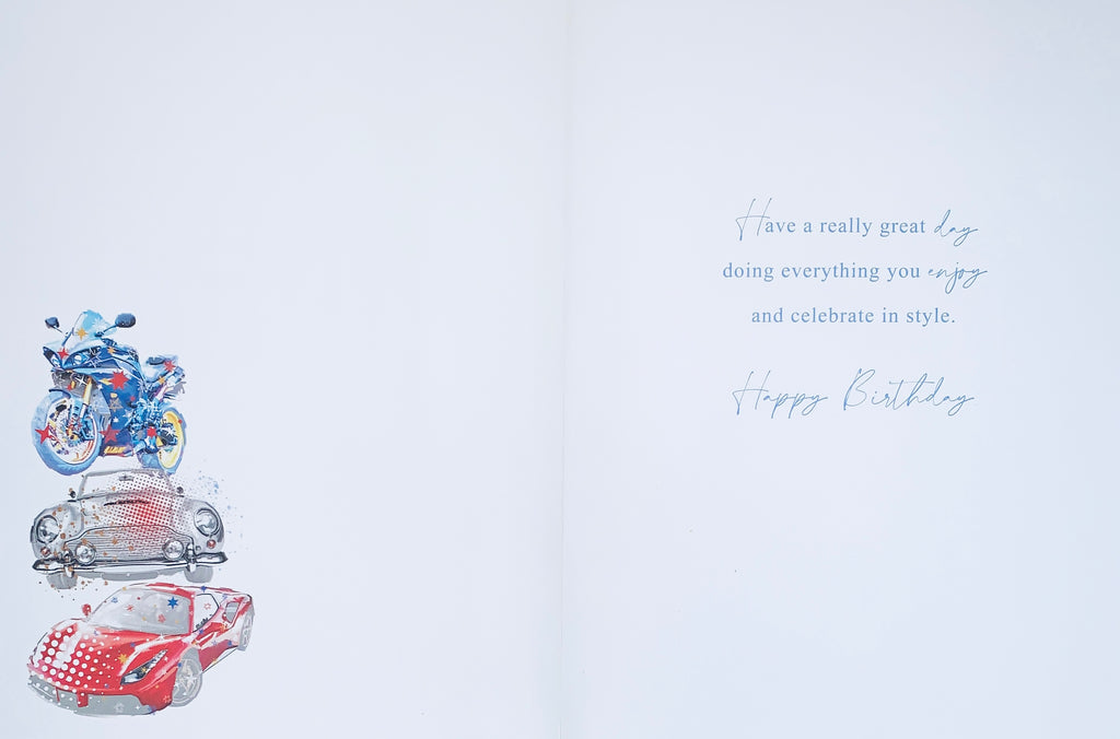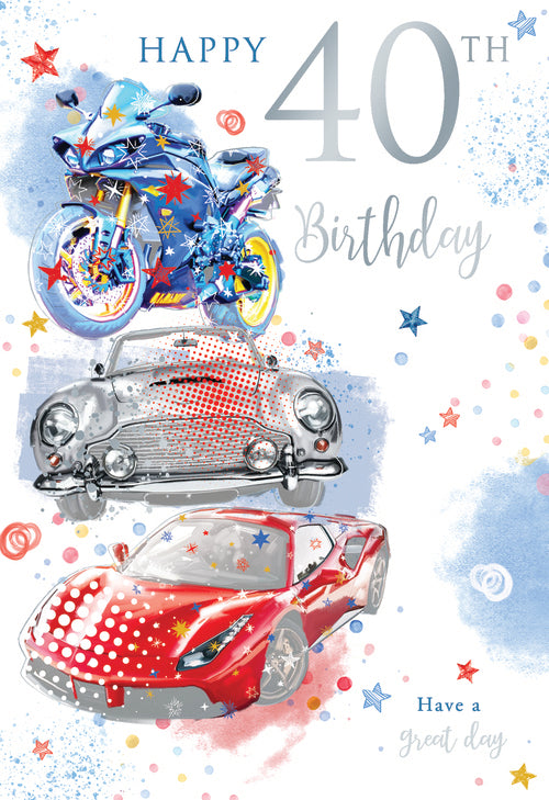 Celebrate their 40th birthday with this 40th birthday card featuring a bold, sports cars and motorbike themed design. This 40th birthday card features a modern car and bike picture with a bold silver foil finish and a full colour insert. This fortieth birthday card is produced in the UK.