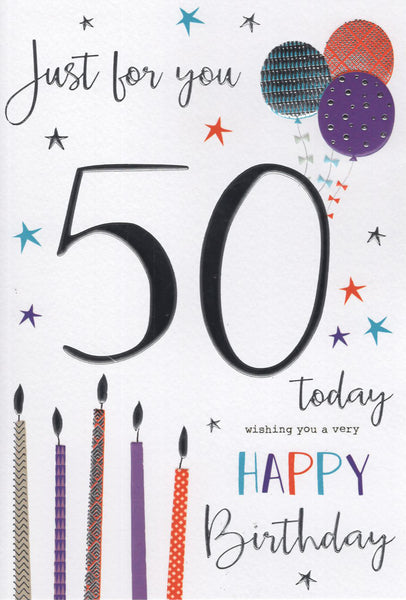 Congratulate them on their 50th birthday with this fiftieth birthday card. This 50th birthday card features a contemporary birthday candles and balloon design. This 50th birthday card is printed on high quality board with a hot foil finish. This greeting card is designed and printed in the UK. Inside this age 50 birthday card is a full colour insert with a short verse.