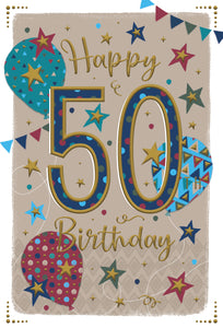 Help them celebrate their special landmark birthday celebrating 50 years on planet earth with this 50th birthday card. This fiftieth birthday card features a contemporary design. This greeting card is printed on high quality board with hot foil finish and full colour insert.