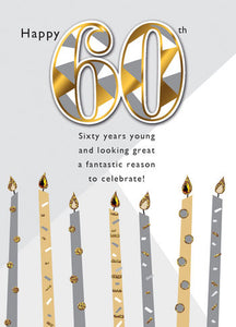Help them celebrate their 60th birthday with this modern 60th birthday card. This age 60 birthday card has multiple decorative attachments and a hot foil and glitter finish to give a modern contemporary feel to this 60th birthday card. This age 60 birthday card is printed on high quality board.