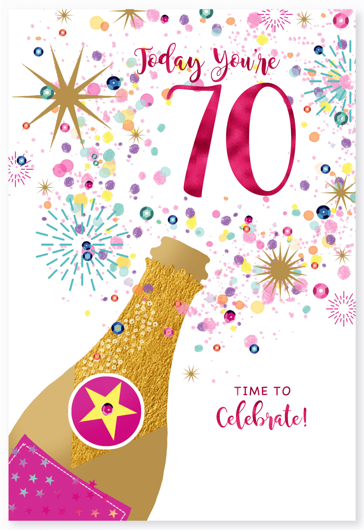 Wish them happy 70th birthday with this contemporary 70th birthday card. This seventieth birthday card features a bold modern champagne design with a hot foil finish.