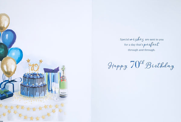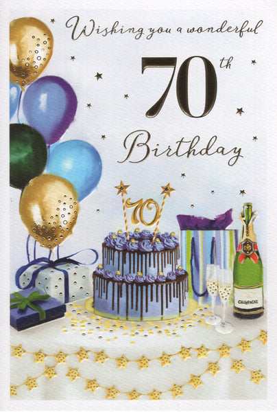 Congratulate them on their special milestone 70th birthday with this wonderful seventieth birthday card. This 70th birthday card features a birthday cake and champagne design. This 70th birthday card is printed on high quality board with a hot foil finish. This greeting card is designed and printed in the UK. Inside this age 70 birthday card is a full colour insert with a short verse.