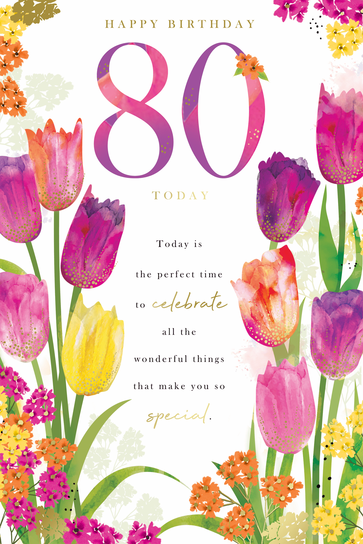 Verse inside reads: Sending warmest wishes for a perfect birthday from beginning to end. Happy 80th birthday