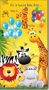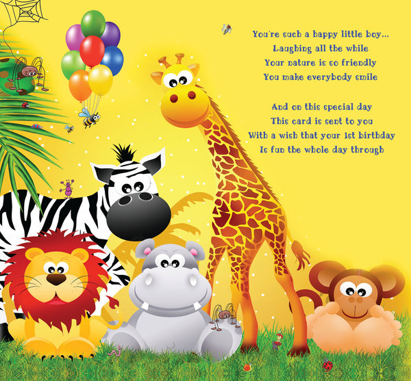Wish a special little boy a wonderful 1st birthday with this first birthday card. This age 1 birthday card features a cute safari animal design with full colour print inside. This age 1 birthday feature bright fun colours to catch the eye of the birthday boy. Medium length verse.