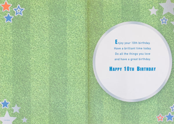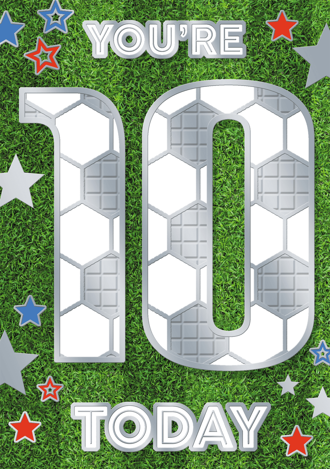 Wish them happy tenth birthday with this age 10 birthday card. This age ten birthday card is the perfect way to celebrate their double digit birthday. This greeting card features a bold football inspired design and has a bright silver foil finish and full colour insert.