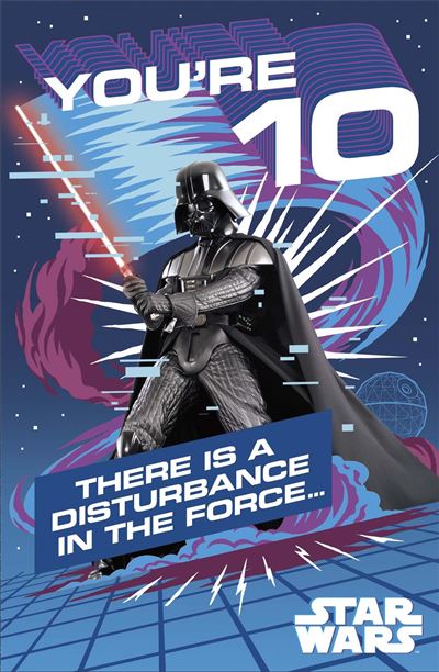 Send out of this world birthday wishes with this Star Wars tenth birthday card. This 10th birthday card features Star Wars Darth Vader design. This 10th birthday card has a hot foil finish and full colour print inside. This greeting card is printed on high quality board sourced from responsible resources and is designed and made in the UK.