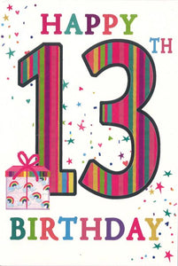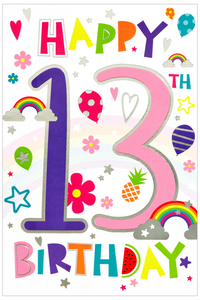 Send happy birthday wishes with this bright and bold age 13 birthday card as they celebrate becoming a teenager. The thirteenth birthday card is perfect for a teen with its modern, fun rainbow design. This greeting card has a hot foil finish.