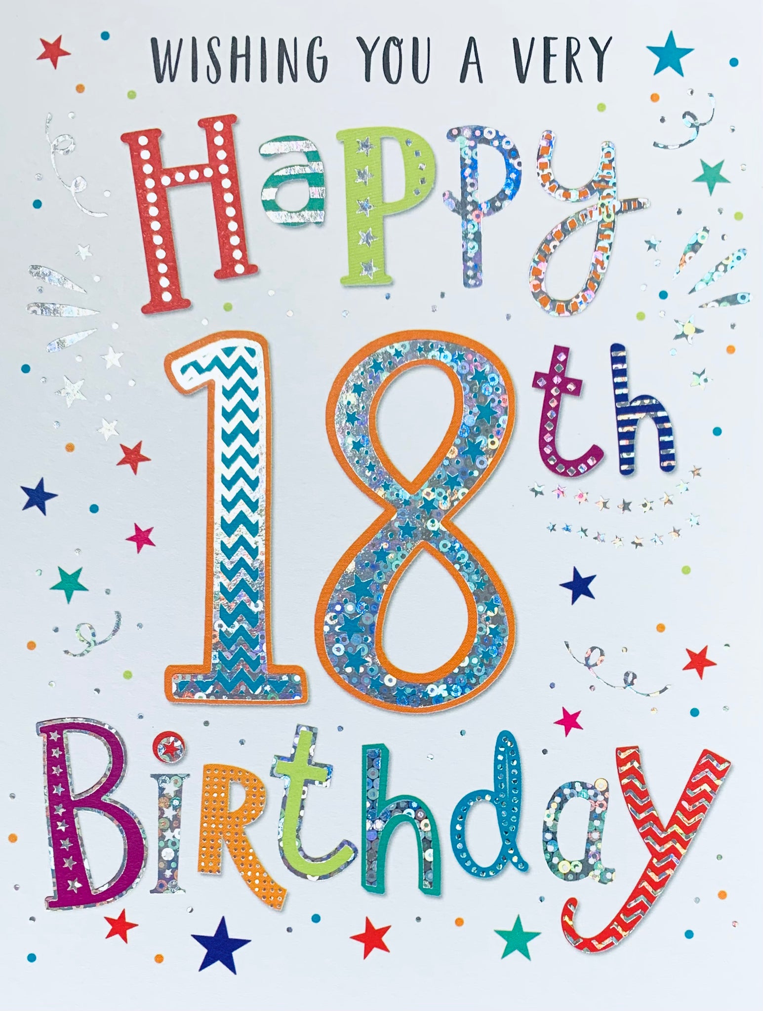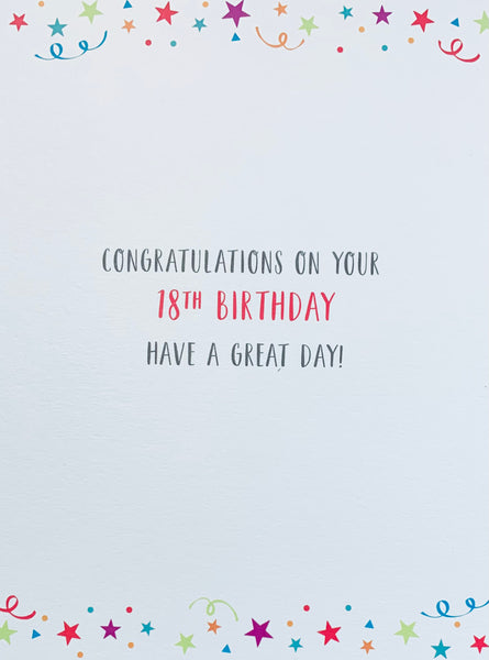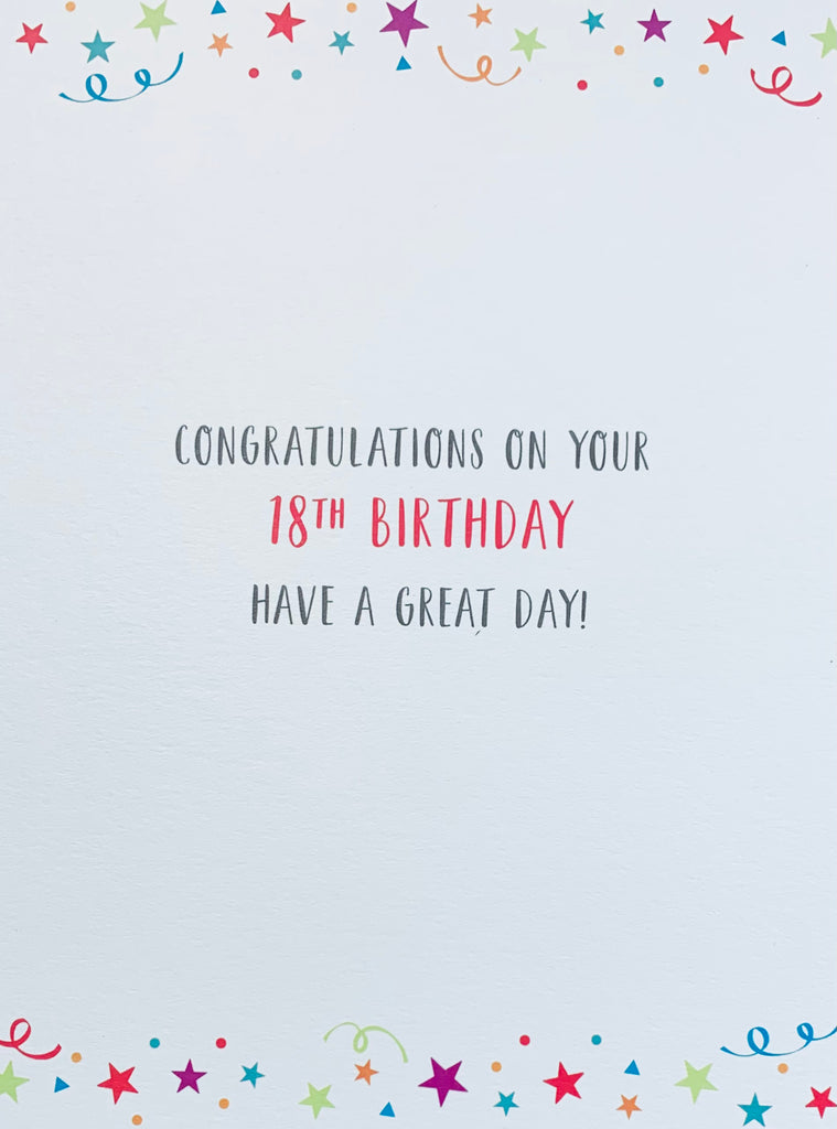 Send special birthday wishes on their special birthday with this 18th birthday card. This 18th birthday card features a bright and colourful modern design with a sparkling holographic foil finish and full colour print inside. Bright bold colours. Short verse.