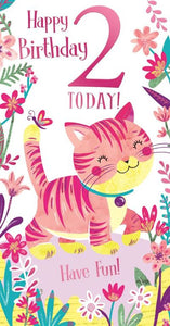 Send them happy birthday wishes on their second birthday with this age 2 birthday card. This age 2 birthday card has a cute cat design with a hot foil finish. This greeting card has a full colour print inside. This greeting card is designed in the UK