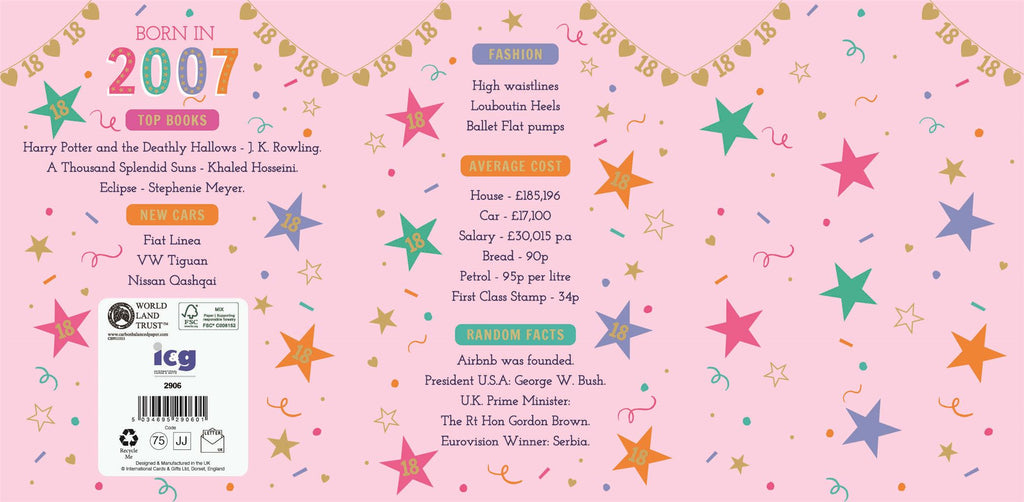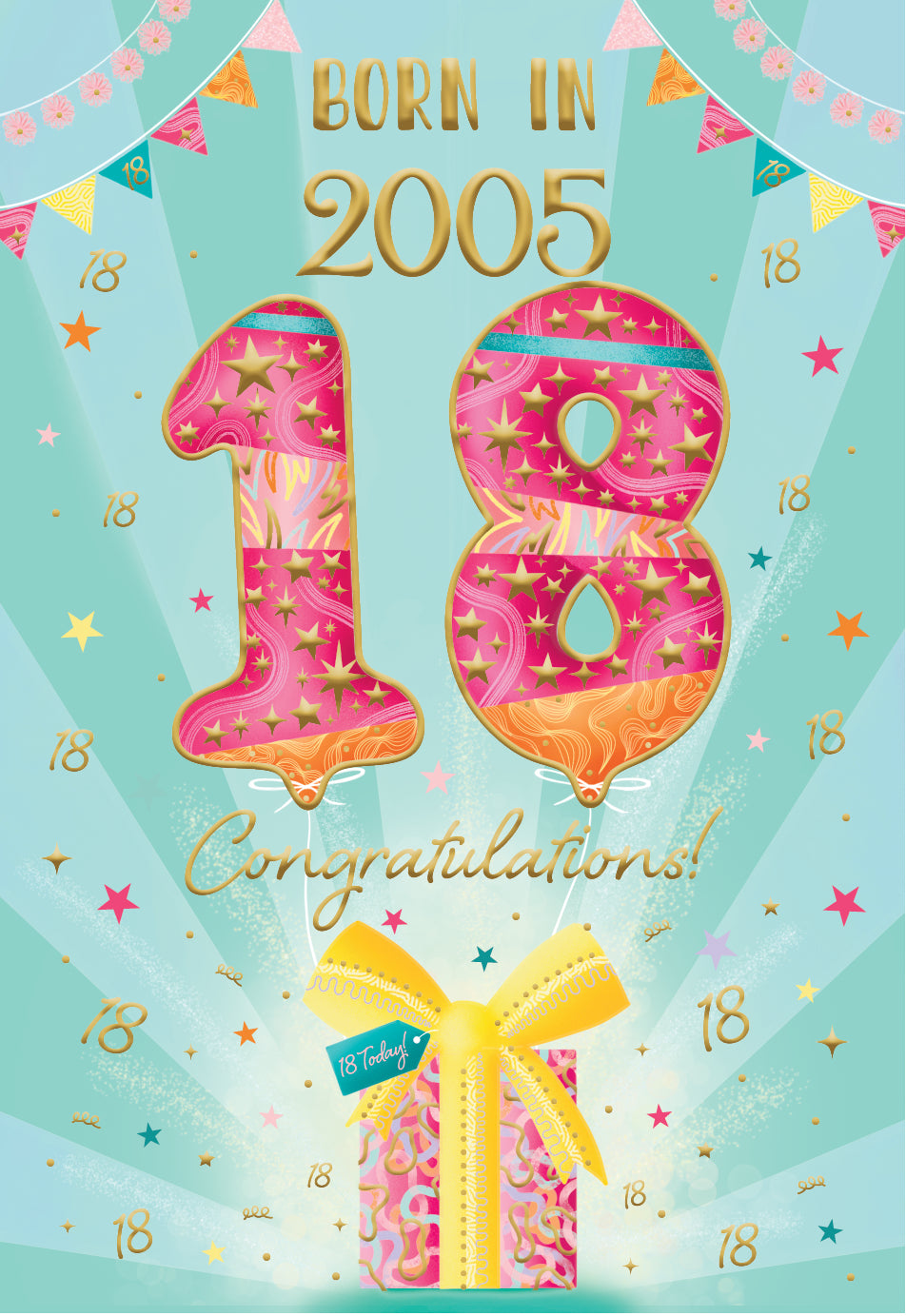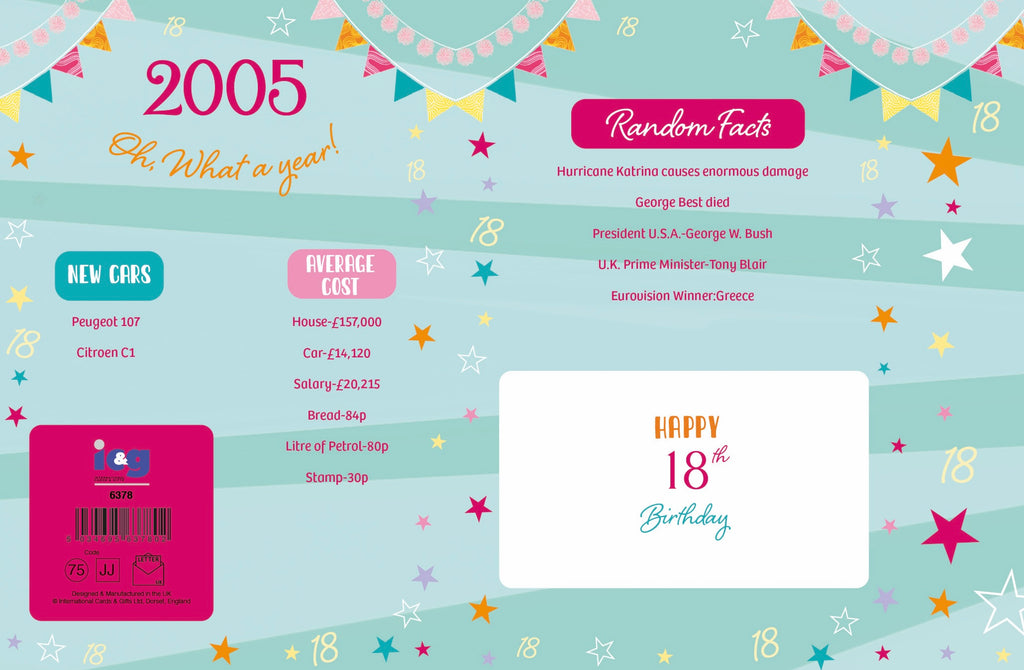Send happy birthday wishes for their eighteenth with this 18th birthday card. This 18th birthday card contains facts from the year the recipient was born including new technology of the year, popular names and popular songs and movies. Hot foil finish. Tri-fold card. This greeting card is printed on high quality board and is designed and printed in the UK