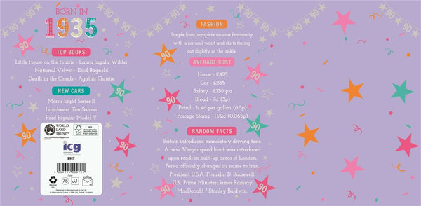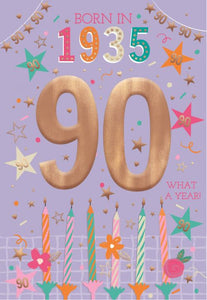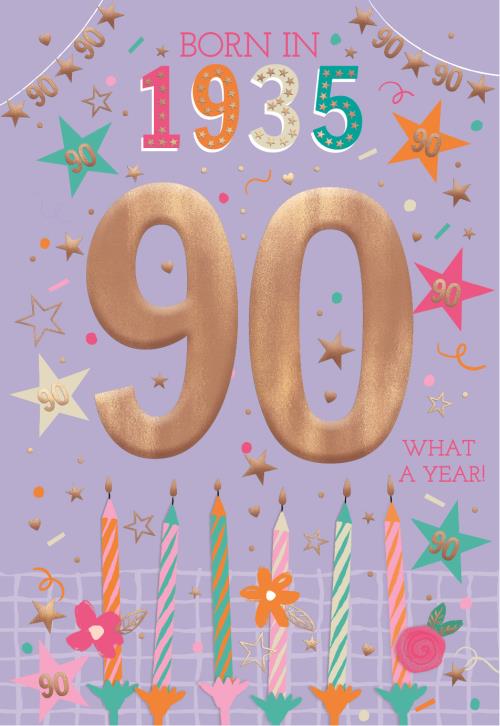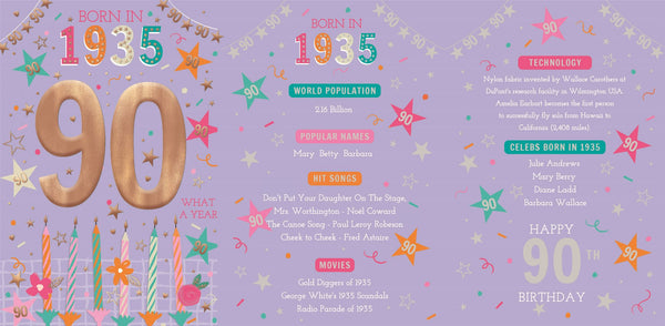 Wish them happy birthday with this lovely 90th birthday card. This 90th birthday card contains facts from the year the recipient was born in 1935 including news and events of the year, popular names and popular songs and movies. This 90th birthday card has a hot foil finish and a fold out tri-fold card.