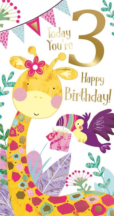 Send wonderful happy birthday wishes on their third birthday with this age 3 birthday card. This age 3 birthday card has a cute giraffe design with a hot foil finish. This greeting card has a full colour print inside. This greeting card is designed in the UK