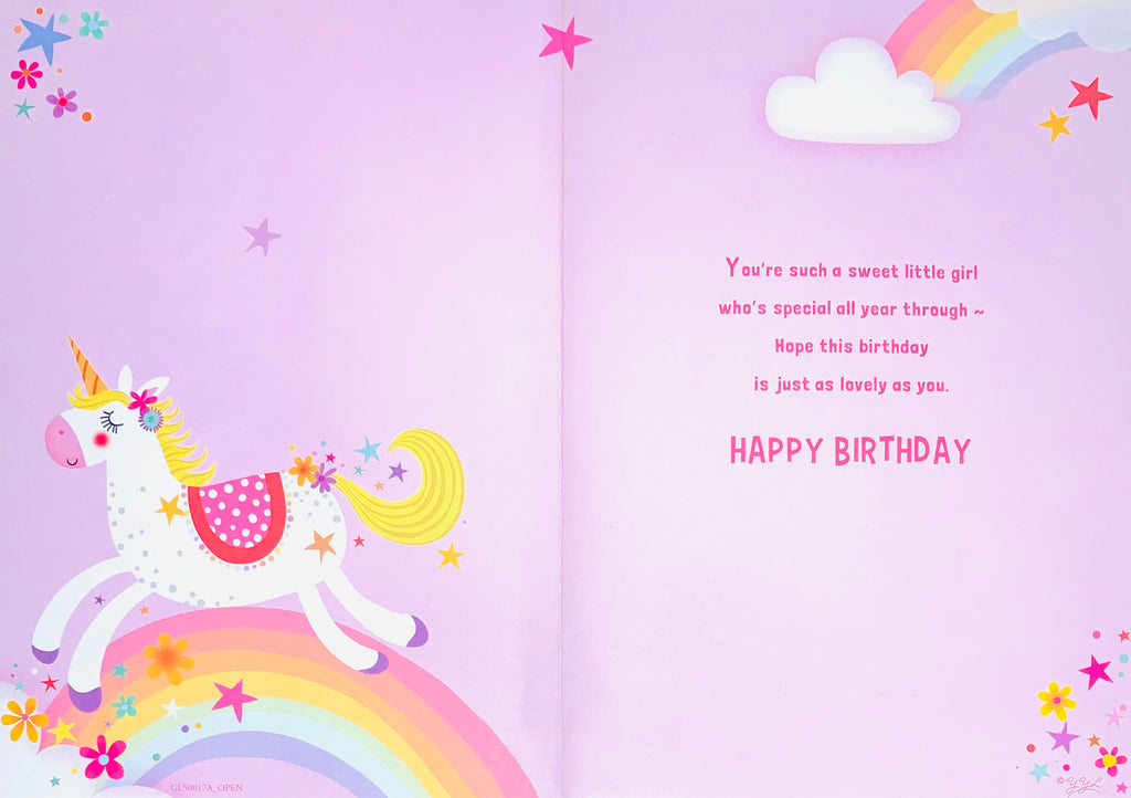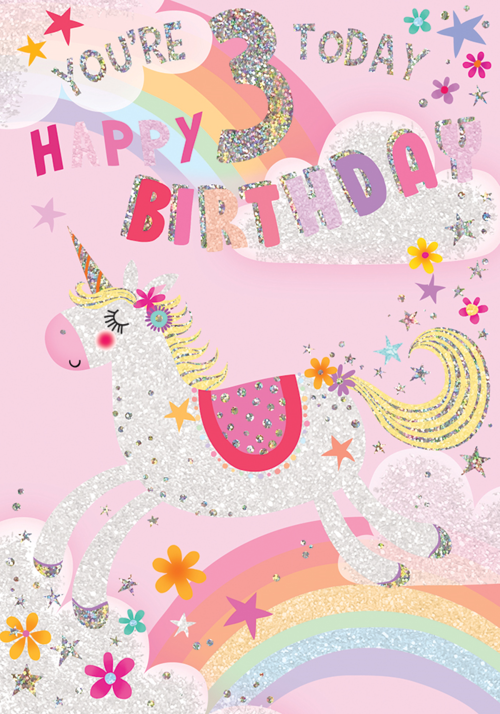 Send your birthday wishes to them to celebrate their third birthday with this cute age 3 birthday card. This age 3 birthday card features a cute and colourful rainbow unicorn design. This 3rd birthday card has a full colour insert and an eye catching silver foil finish and sparkling glitter accents.