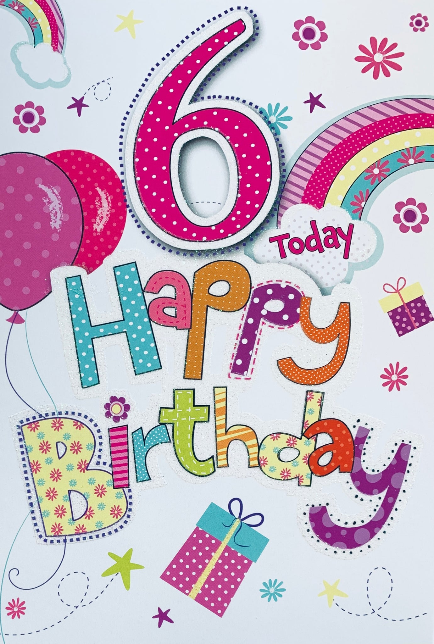 Wish them a fun filled birthday with this age 6 birthday card. This 6th birthday card features a bright, bold rainbow design with glitter finish. This greeting card has full colour print inside.