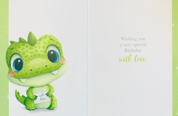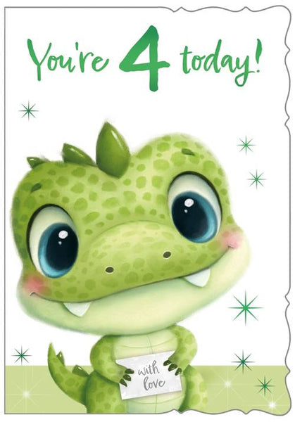 Help them celebrate turning four with this playful birthday card! Featuring a cute green dinosaur design, bright green foil finish, and full colour print inside, it's the perfect way to send special birthday wishes.