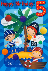 Wish them an amazing fun filled fifth birthday with this age 5 birthday card. This age 5 birthday card features a fun pirate design full colour print inside.