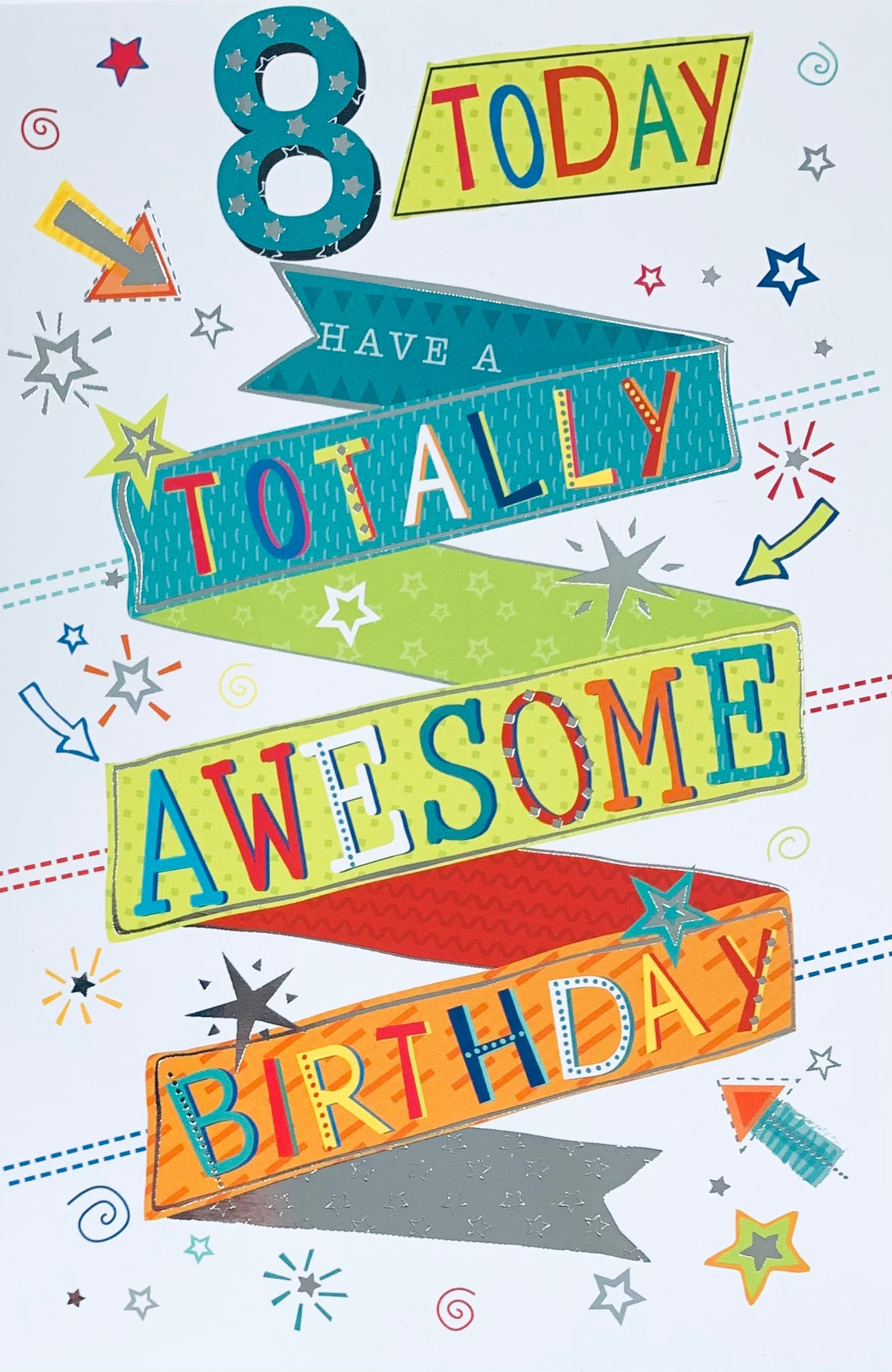 Send birthday wishes for a fantastic birthday with this age 8 birthday card. This 8th birthday card features a bold colourful modern design. This age 8 birthday card has a hot foil finish and full colour print inside.