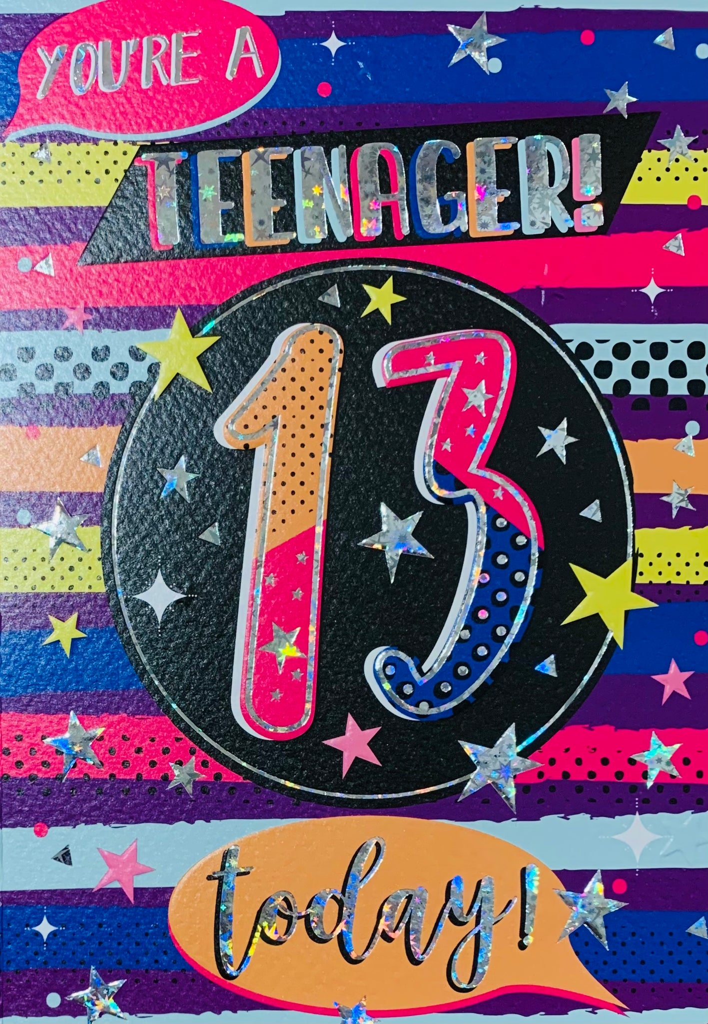 Wish them a very happy birthday as they become a teenager on this very special birthday with this bright 13th birthday card. This thirteenth birthday card features a bold and very pink design. This 13th birthday card is printed on high quality board with a gorgeous pink foil finish and full colour insert. This teenager birthday card is designed and printed in the UK.