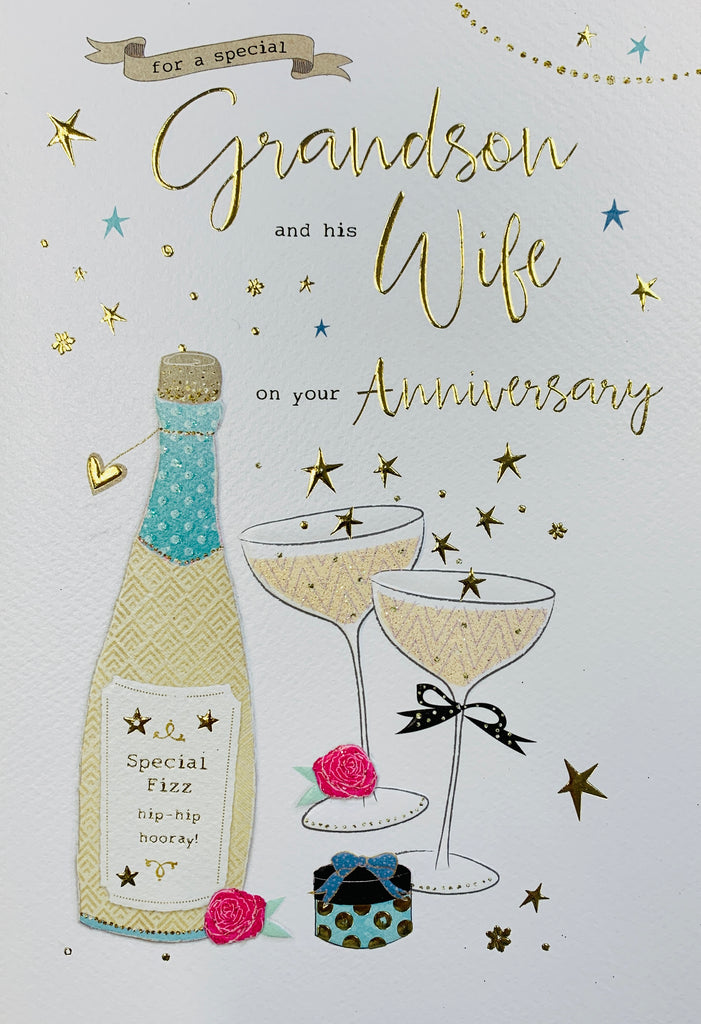 Wish your Grandson and his wife a happy anniversary with this Grandson and his Wife anniversary card. This Grandson and Wife anniversary card features a sparkling champagne design. This Grandson and his Wife anniversary card is printed on high quality board with a golden foil finish with a full colour insert. Short verse. This Grandson and his Wife anniversary card is designed and printed in the UK.