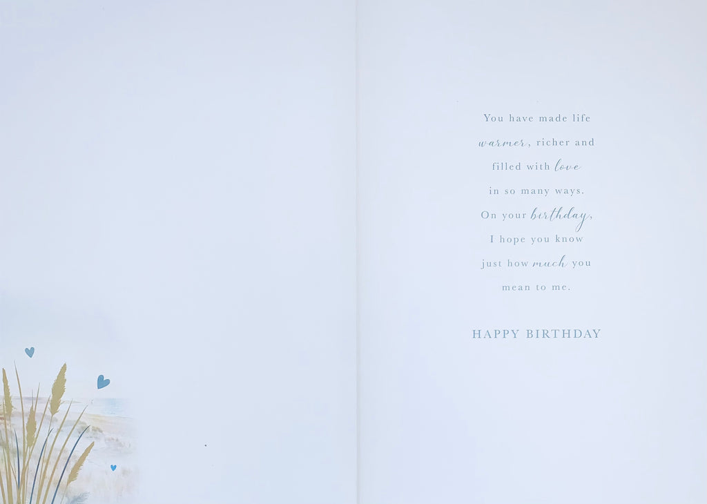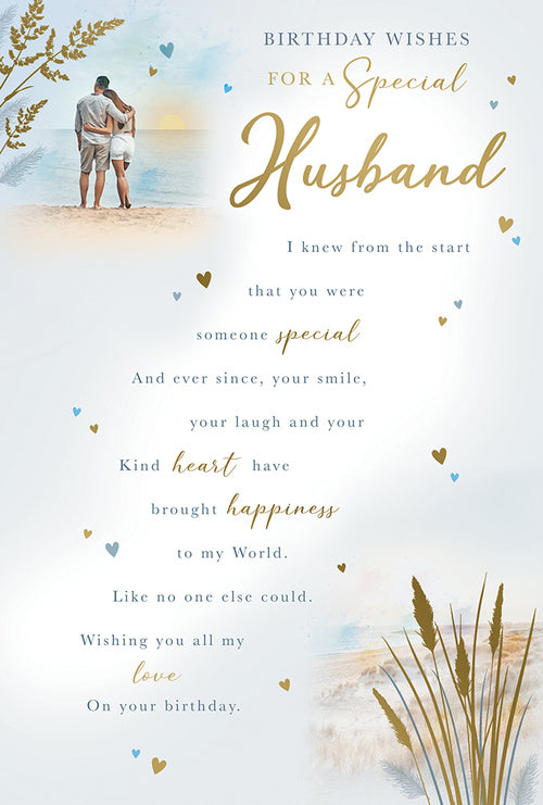 Send love filled happy birthday wishes to your Husband with this traditional Husband birthday card. This greeting card features a romantic Beach walk design with a golden foil finish. This card has a full colour insert with a long and sentimental verse.