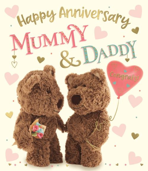 Send loving wedding anniversary wishes to Mummy and Daddy with this very cute Mummy and Daddy anniversary card. This Mummy and Daddy wedding anniversary card features a cute bear design. This greeting card is printed on high quality board with a shiny gold foil finish. This mummy and daddy anniversary card has a full colour insert.