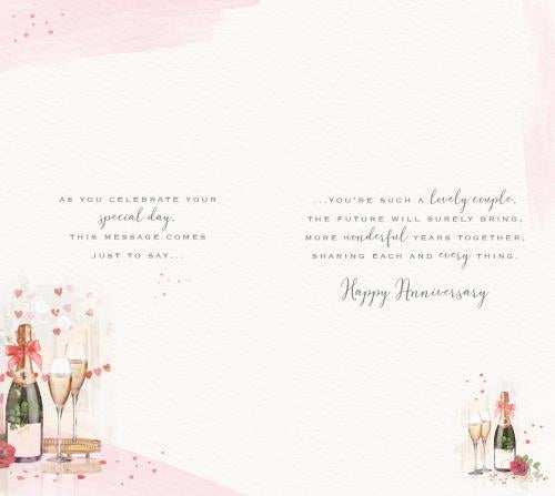 Wish your Sister and Brother-in-law happy anniversary with this Sister and Brother-in-law anniversary card. This Sister and Brother-in-law anniversary card features a beautiful cake and bubbly design. This Sister and Brother-in-law anniversary card is printed on high quality board with a vibrant gold foil finish and full colour insert. This Sister and Brother-in-law anniversary card is designed and printed in the UK on board sourced from environmentally responsible resources