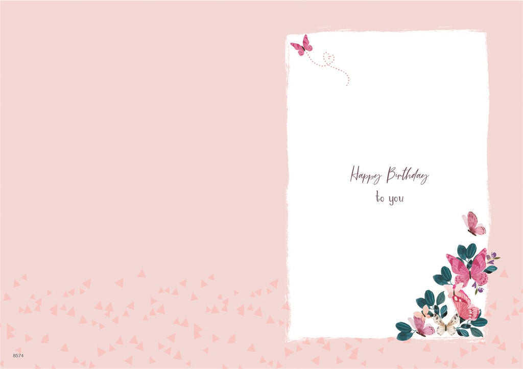Wish your Auntie a very happy birthday with this lovely Auntie birthday card. This traditional Auntie birthday card features a beautiful cake and butterflies design. Inside this Auntie birthday card is a full colour insert with a short verse. This Auntie birthday card is printed on high quality board with a rose gold foil finish and is designed and printed in the UK.