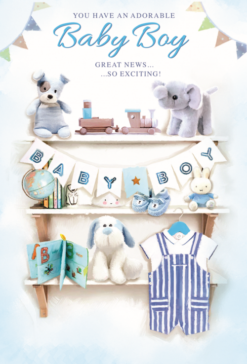 Congratulate them on the birth of their beautiful baby boy with this baby boy birth congratulations card. This baby boy birth congratulations card has a glitter finish. This greeting card has a full colour print inside. Short verse.