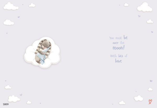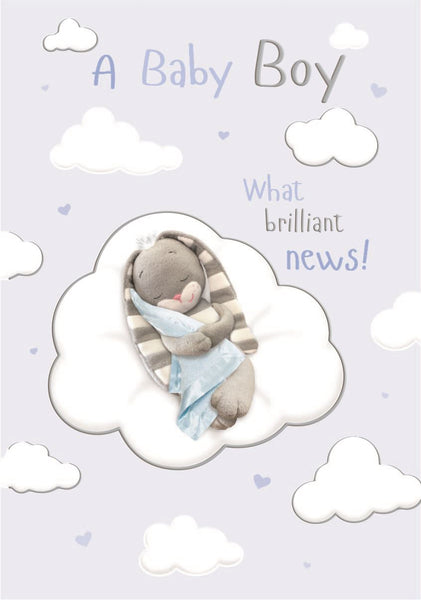Greet the newest addition to the world with this incredibly adorable newborn baby boy congratulations card. Featuring an endearing rabbit illustration, this card is crafted from premium board and embellished with a shiny silver foil finish and a vibrant colour insert.