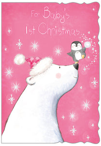 Celebrate their 1st Christmas with this lovely baby’s first Christmas card. This baby’s 1st Christmas card features a a cute polar bear Christmas design and has a glitter finish and full colour insert. This greeting card is designed in the UK.