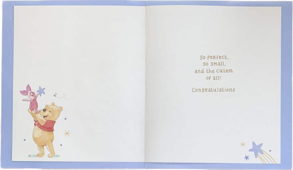 Send your best wishes and greet the new baby boy with this adorable Winnie the Pooh baby boy birth congratulations card. The card is the ideal way to show your love for the tiny new one. Adorable Winnie the Pooh design printed on high-grade board with hot foil finish and full-color insert. Sweet verse included.