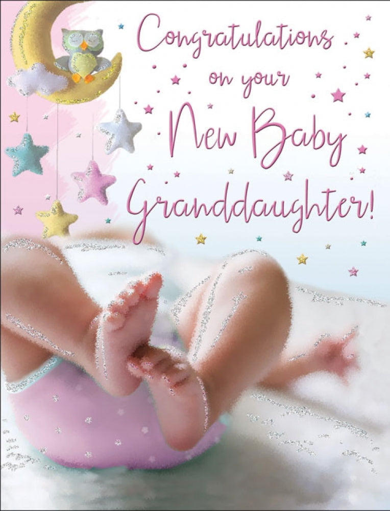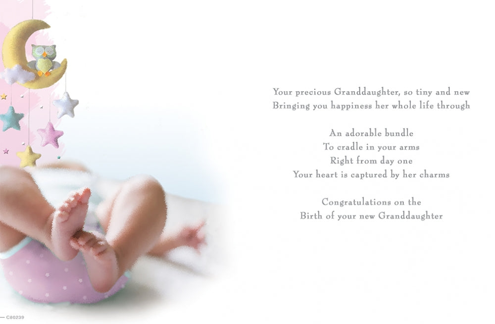 Send them your congratulations on the wonderful news of the birth of their Granddaughter with this Granddaughter birth congratulations card. This birth of your Granddaughter congratulations card features a traditional design with hot foil and glitter finish. This greeting card has a full colour insert. Medium length verse.