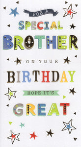 Wish your Brother happy birthday with this Brother birthday card. This Brother birthday card features a bold colourful modern text design. This Brother birthday card has a contemporary design and is printed on high quality board with hot foil finish and full colour insert. Fun bright colours. This Brother birthday card is designed and printed in the UK