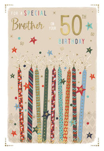 Send happy birthday wishes to your Brother on his 50th birthday with this Brother 50th birthday card. This 50th birthday card for Brother celebrates the special occasion of this landmark birthday. This Brother 50th birthday card features a contemporary birthday candles design. This greeting card is printed on high quality board with golden foil finish and has a full colour insert. This greeting card is designed and printed in the UK