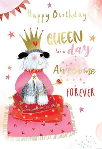 Wish her a wonderful day as she celebrates her birthday. This birthday card for her features a cute dog queen for the day design with a hot foil finish. This birthday card for her has a full colour insert. This greeting card is designed and printed in the UK.