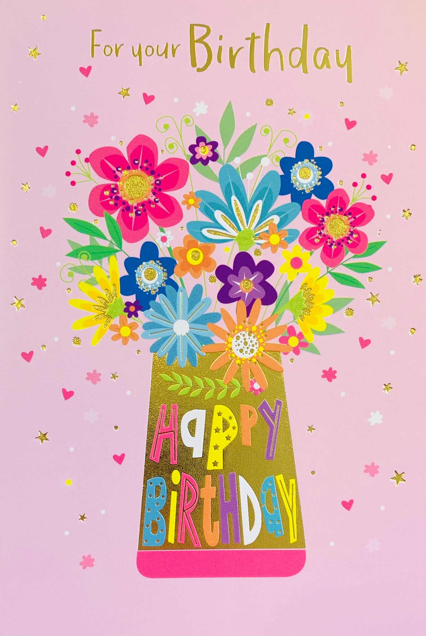 Wish her a happy birthday with this contemporary birthday card for her. This birthday card for her features a modern flower design and has a hot foil finish and full colour print inside. Short verse.