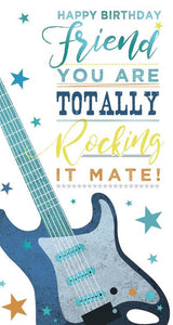 Wish him a wonderful day as he celebrates his birthday. This birthday card for him features a bold modern guitar design with a hot foil finish. This birthday card for him has a full colour print inside. This greeting card is designed and printed in the UK.
