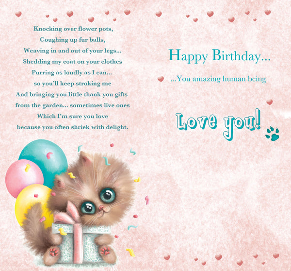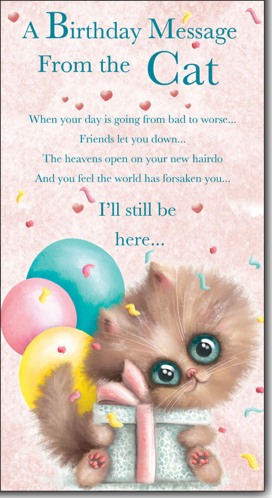 Send happy birthday wishes from their fur baby on their birthday with this birthday card from the cat! Featuring an adorbs cat pic and a heartfelt verse, this card will be sure to make their day even brighter. Crafted lovingly in the UK, heart-filled feline birthday-wishes await!