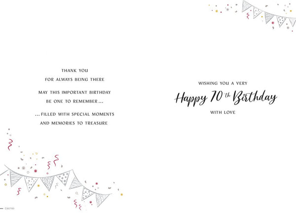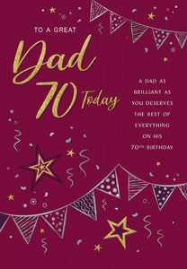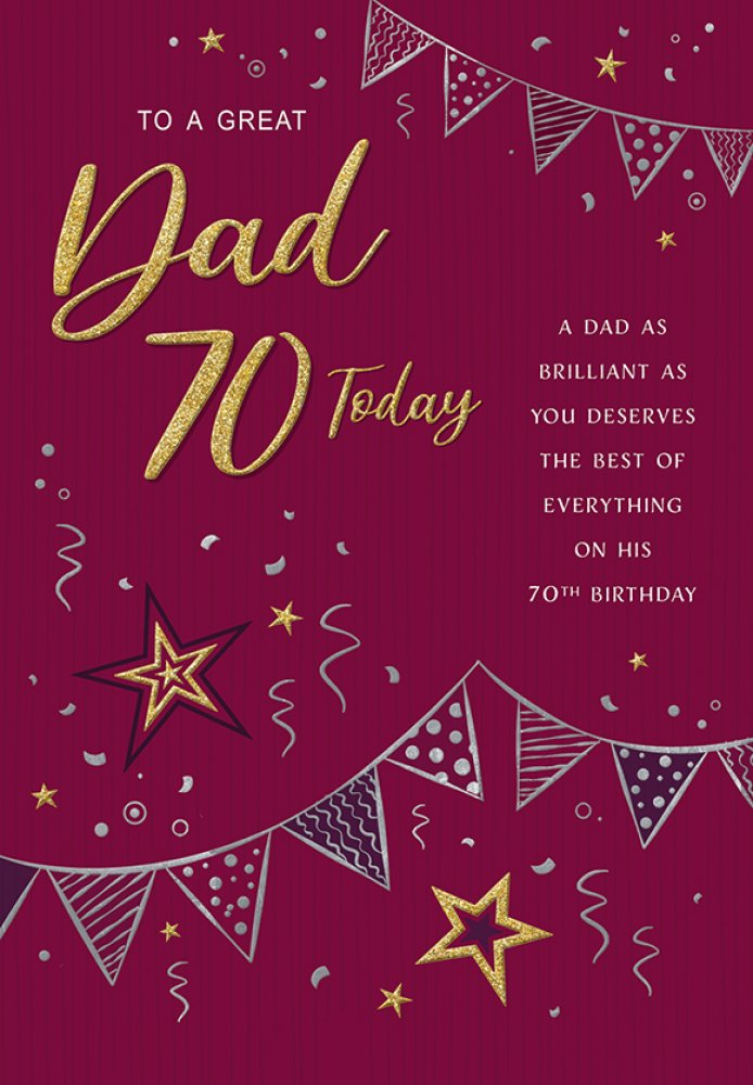 Send your dad special birthday wishes on this landmark birthday with this wonderful Dad 70th birthday card. This Dad 70th birthday card features a contemporary design with an eye catching hot foil and glitter finish with a full colour insert. This Greeting card is designed and printed in England.