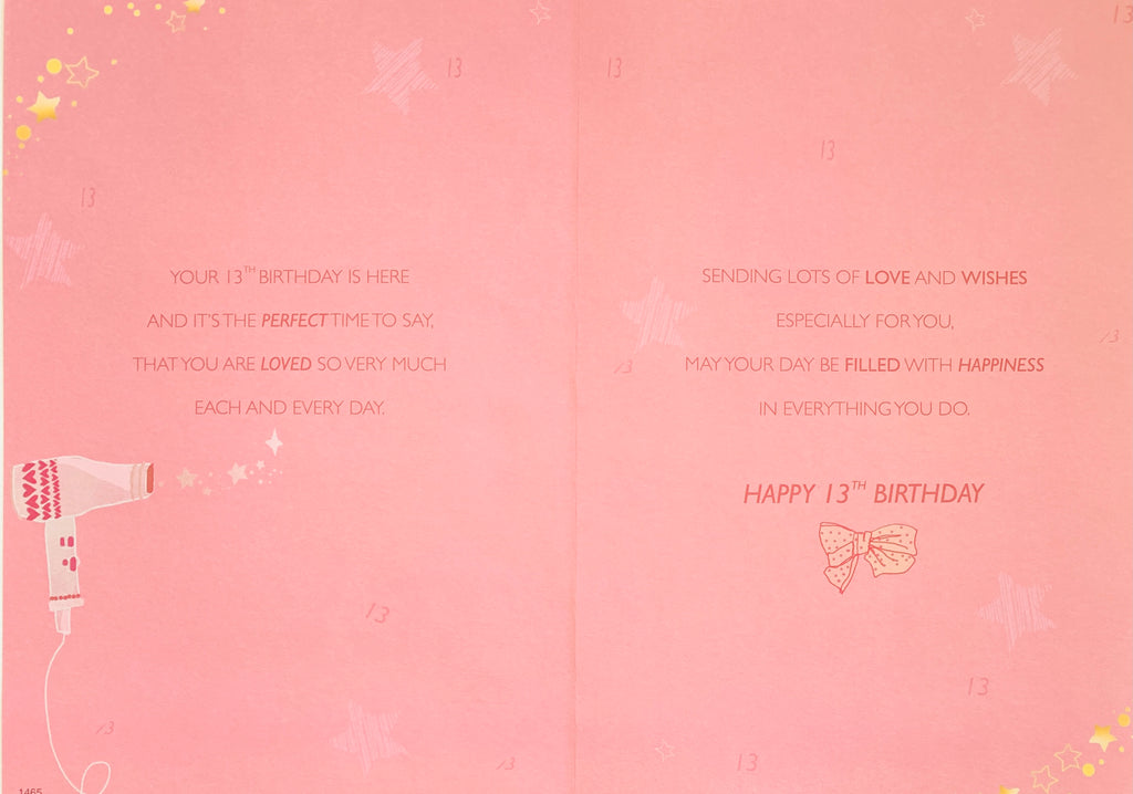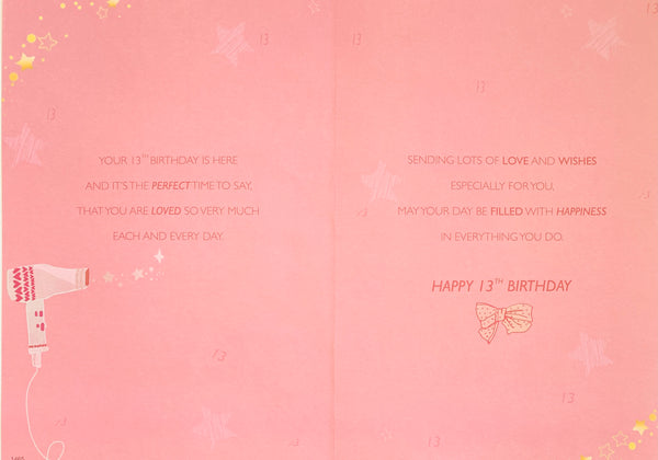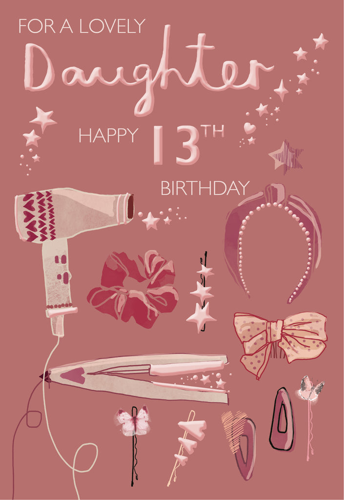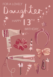 Send happy birthday wishes to your Daughter on her 13th birthday with this Daughter 13th birthday card. This Daughter 13th birthday card celebrates the special occasion of becoming a teenager. This Daughter 13th birthday card features a contemporary design. This greeting card is printed on high quality board with hot foil and glitter finish and has a full colour insert. This greeting card is designed and printed in the UK