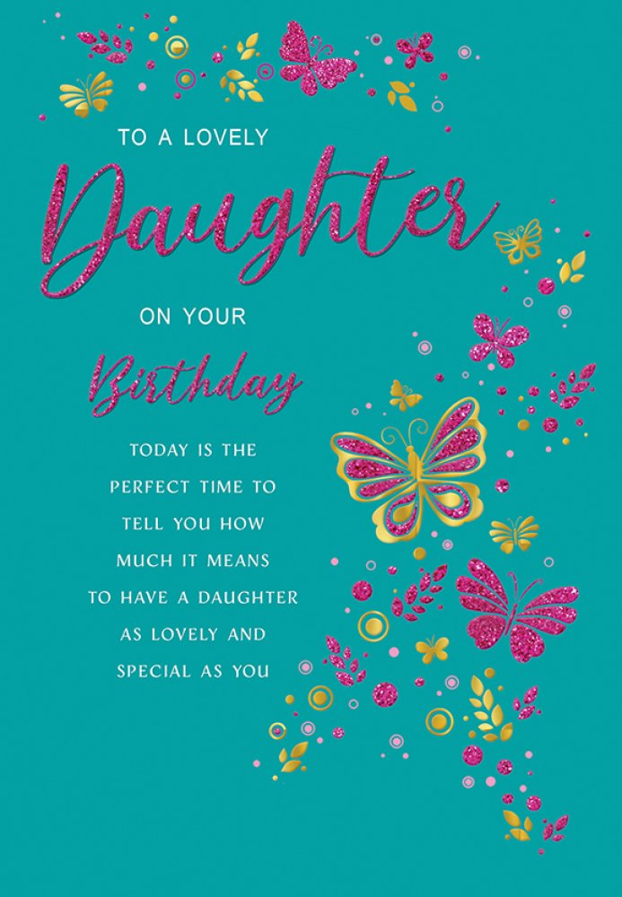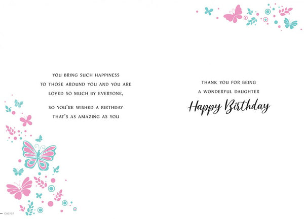 Wish your Daughter happy birthday with this sentimental Daughter birthday card. This Daughter birthday card features a lovely modern butterfly design. Inside this Daughter birthday card is a full colour insert with sentimental verse. This Daughter birthday card features a hot foil and glitter finish. This greeting card is designed in the UK.