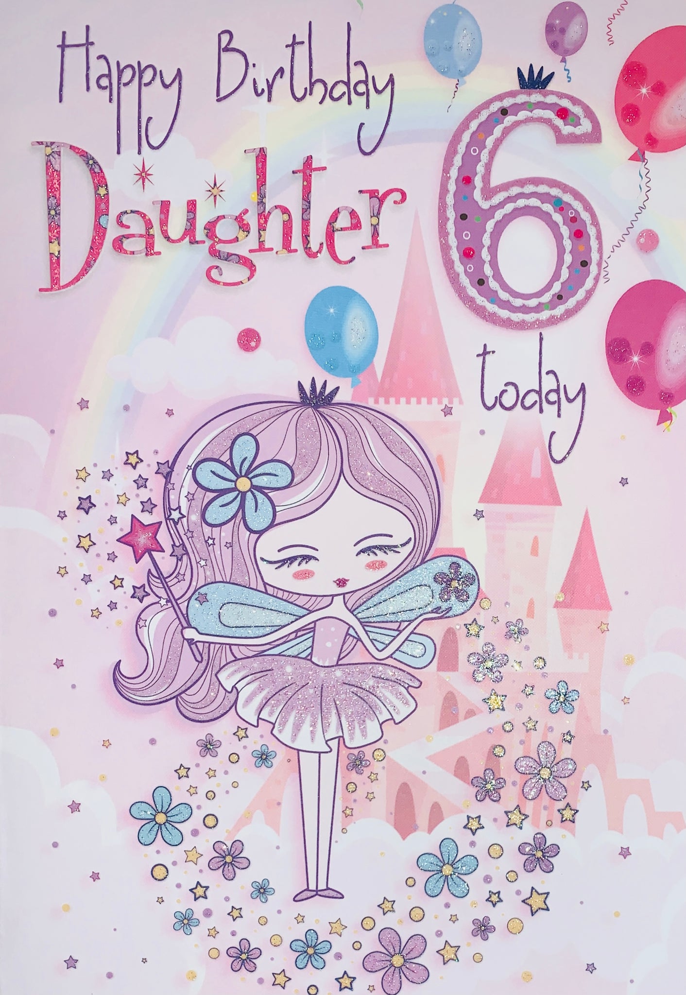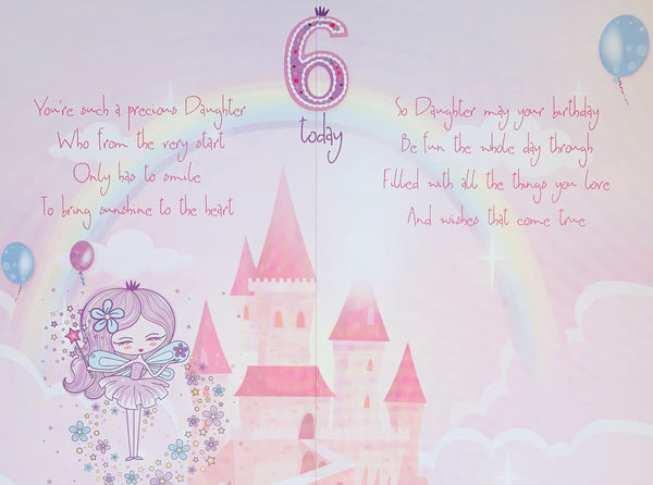 Wish your Daughter a magical 6th birthday with this Daughter 6th birthday card. This Daughter 6th birthday card features a cute fairy princess design. This greeting card is printed on high quality board with a glitter finish and full colour print inside. Medium length verse. This 6th birthday card for Daughter is designed and printed in the UK.