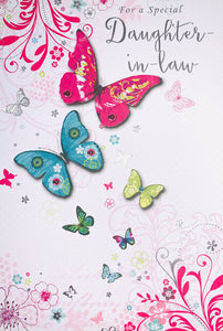 Wish your Daughter in law happy birthday with this lovely Daughter in law birthday card. This Daughter in law features a traditional butterfly design with a hot foil finish. Full colour print inside.