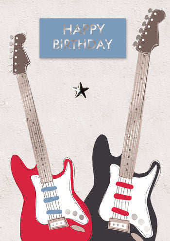 Send birthday greetings with this birthday card for him. This general birthday card has a music design featuring electric guitars with hot foil finish and decorative attachment.