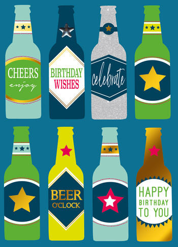 Send birthday greetings with this birthday card for him. This general birthday card has a bold design of beer bottles with hot foil finish and decorative attachment.