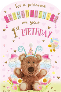Wish your Granddaughter a wonderful first birthday with this very cute Granddaughter 1st birthday card. Celebrate this very special occasion with this lovely greeting card for a Granddaughter’s first birthday. This Granddaughter 1st birthday card features a cute fairy bear design and is printed on high quality board with silver foil finish. This greeting card has a full colour insert and is designed and printed in the Uk and produced from environmentally responsible materials.